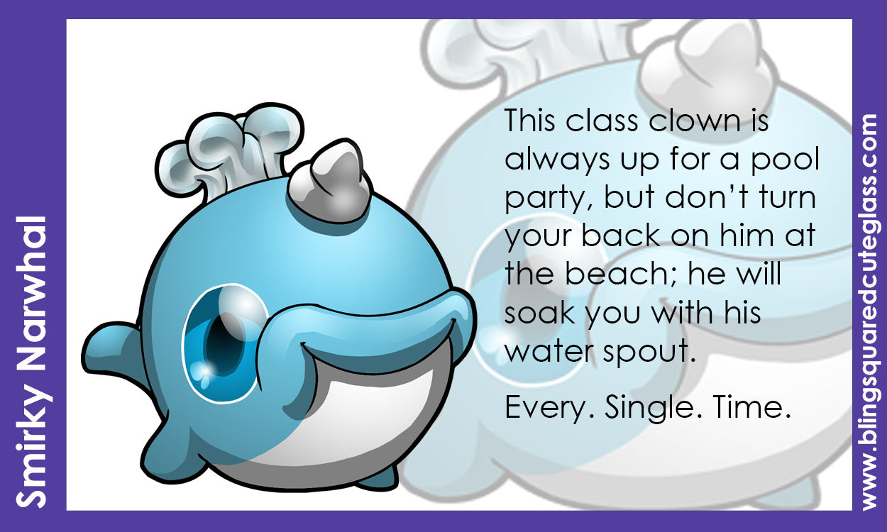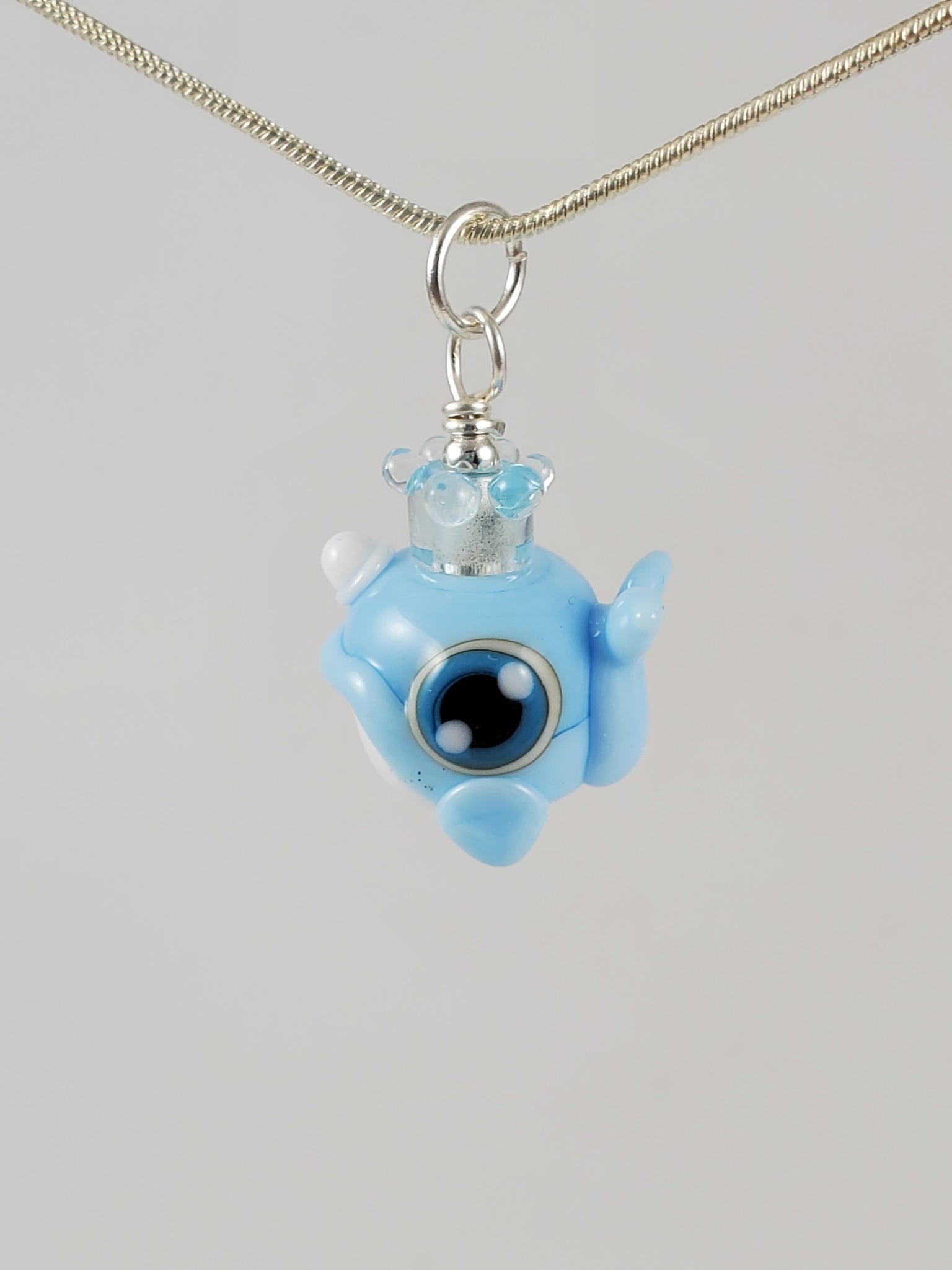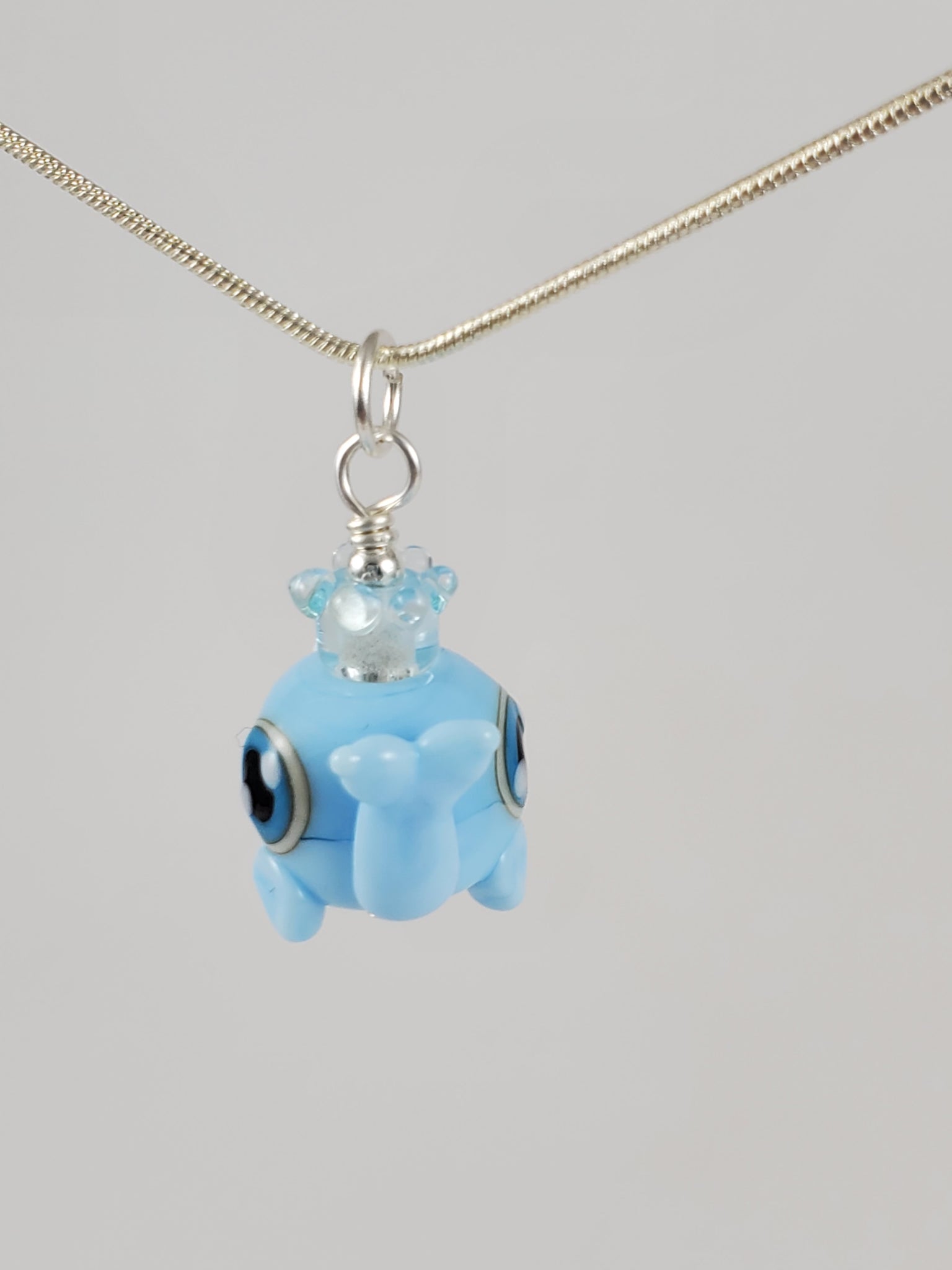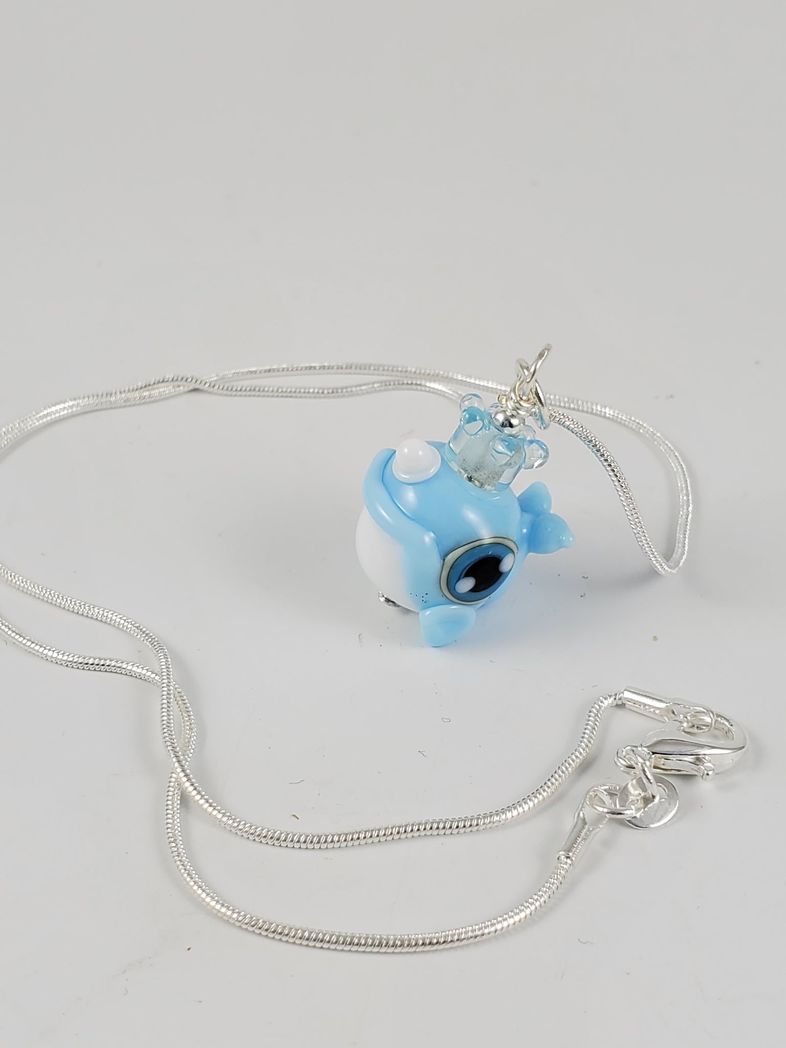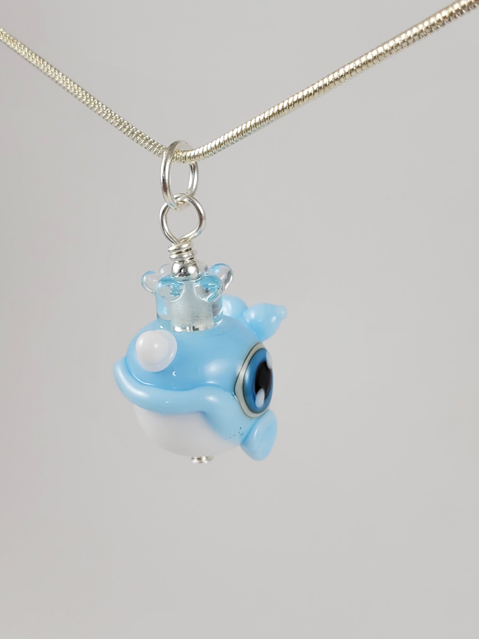 Sculpted in a gorgeous pale transparent, he features a white belly, smiling lip detail, little fins and tail. He also sports a pale aqua water spout and a tiny white horn. With our signature blue eyes, of course.