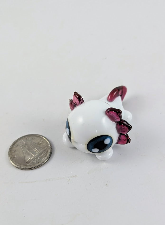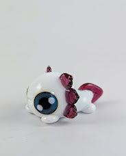He is sculpted in white and features a stunning magenta fronds, tail and a cute little smile...and, of course, our signature blue dot stacked eyes.