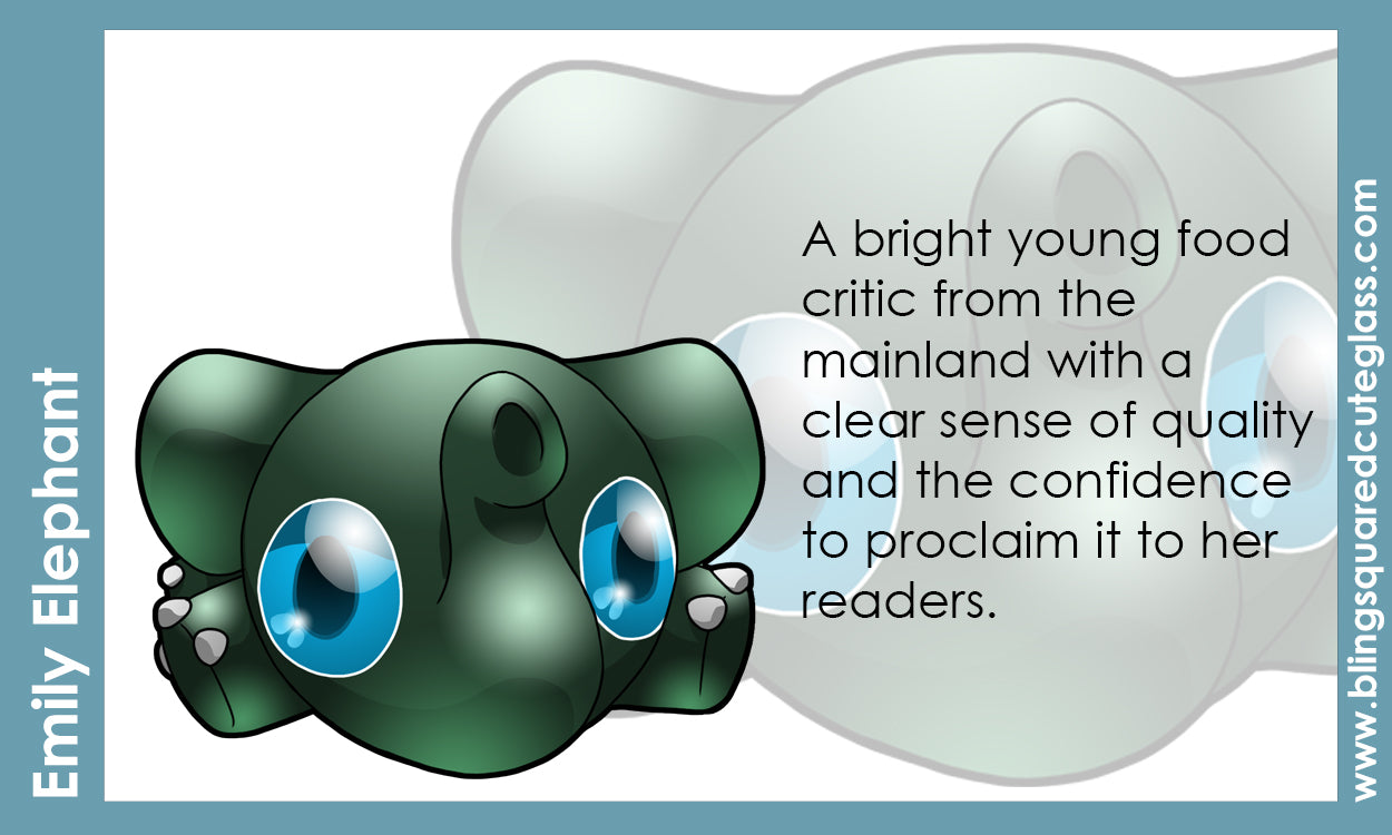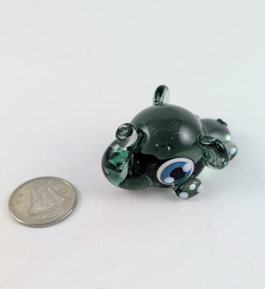 She is sculpted in transparent steel grey and features an adorable trunk, tiny stocky legs with white toenails, a bitty tail, floppy ears and, of course, our signature blue dot stacked eyes.