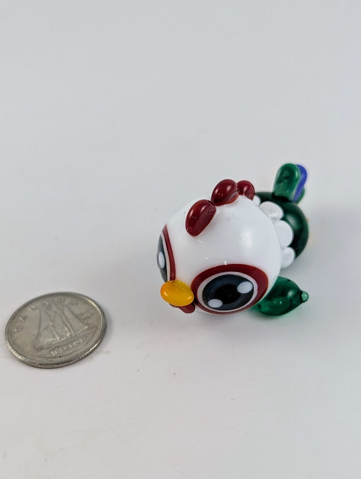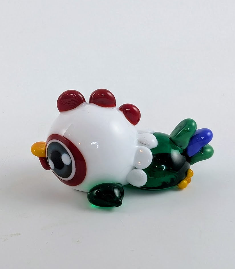He is sculpted in white and features a red mask, comb and waddle, transparent emerald body, green and blue tail and teensy claws...and, of course, our signature blue dot stacked eyes.