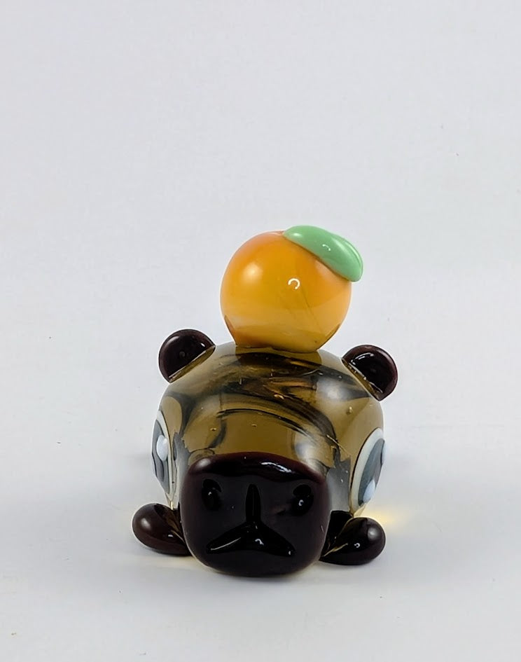 He is sculpted in transparent brown with dark brown muzzle, feet and ears...and, of course, our signature blue dot stacked eyes. He sports an orange on this head.