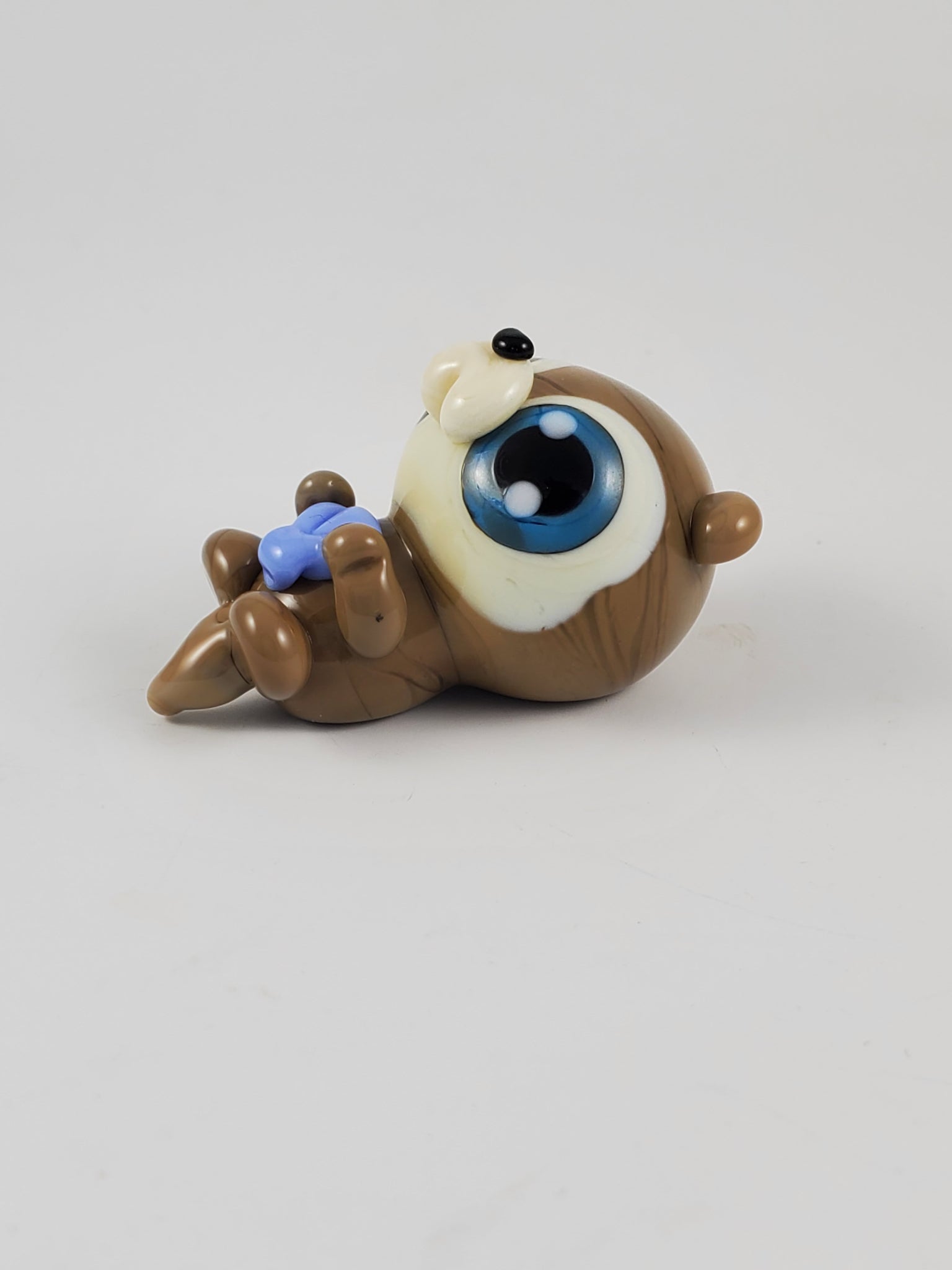 Sculpted in pale brown glass, Tami features an opaque ivory mask, muzzle, and cheeks. Her legs, hugging arms and tail details are sculpted in that sparkly clear brown, and she's all finished of with a cute little black nose and an opaque periwinkle shell snack. With our signature blue eyes.