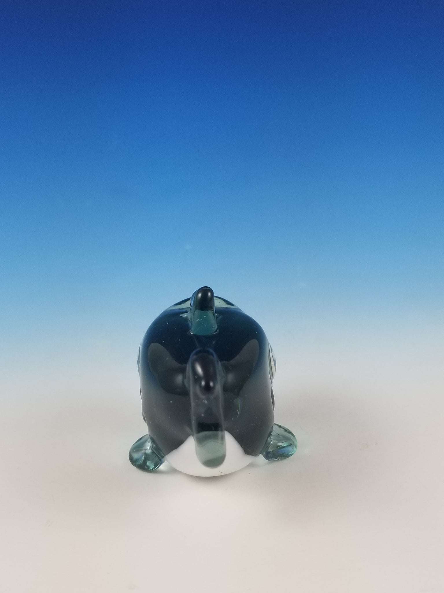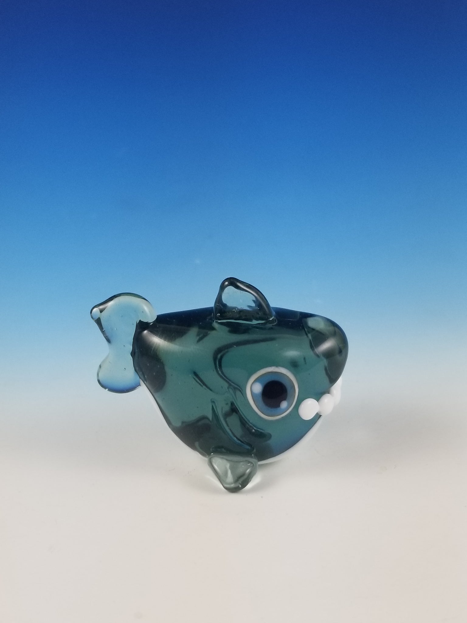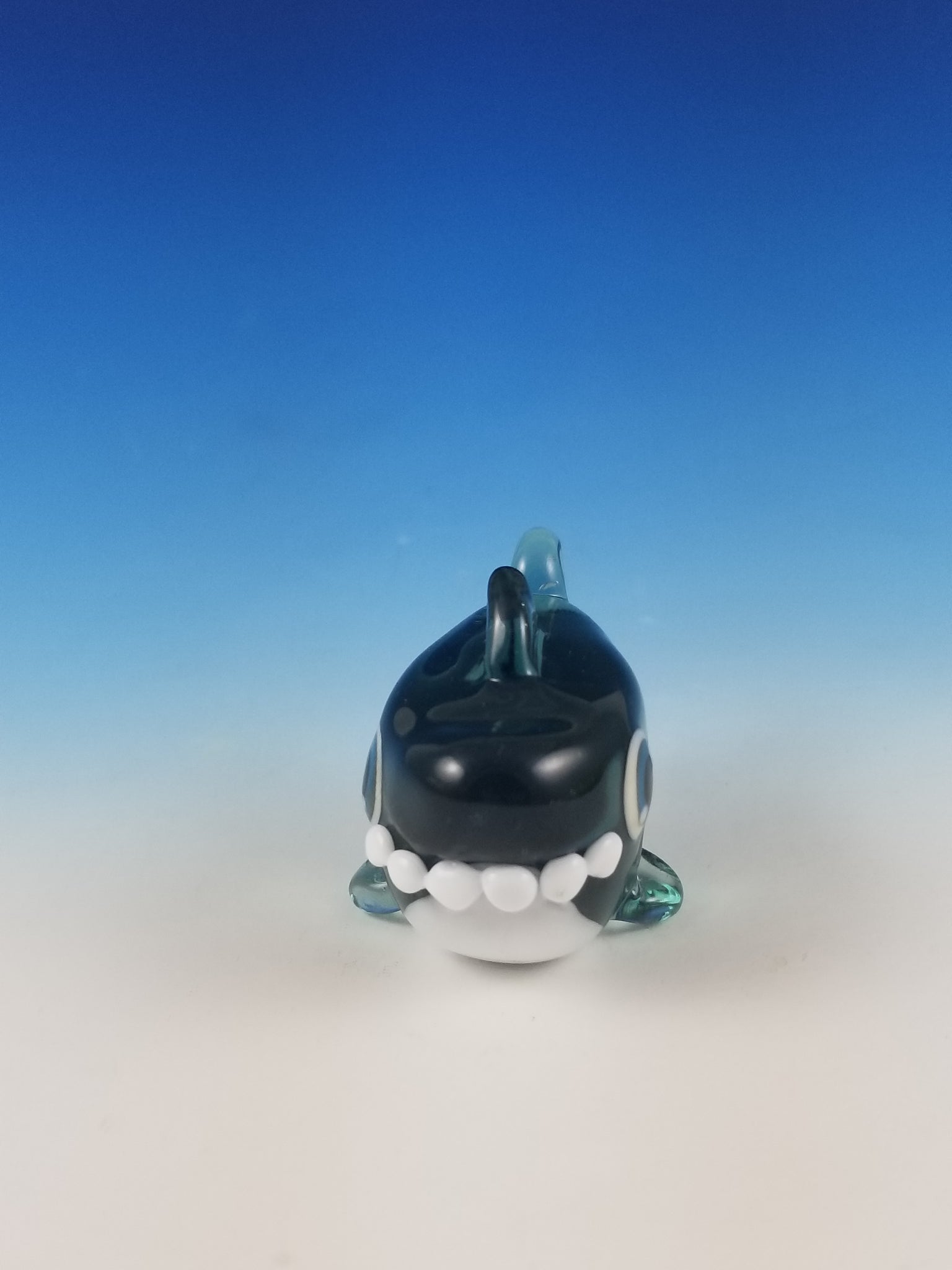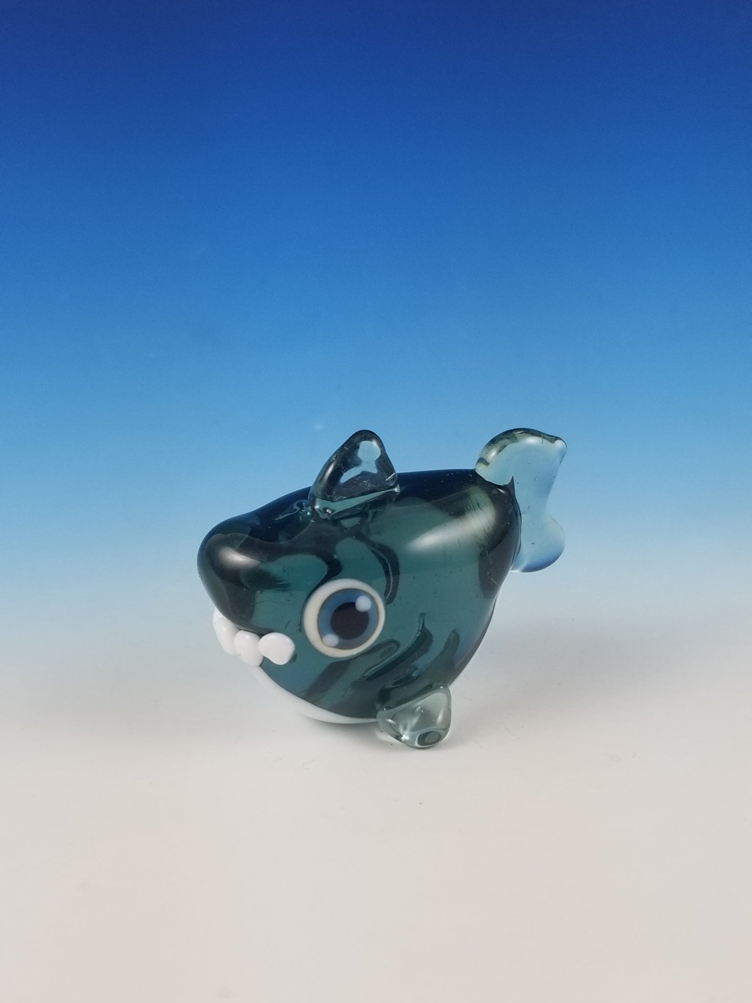 Sculpted in transparent steel grey with a white tum, this cutie features dorsal and pectoral fins, a sharky tail, gill slits and six pointy teeth beneath an adorable snub nose. With our signature blue eyes.