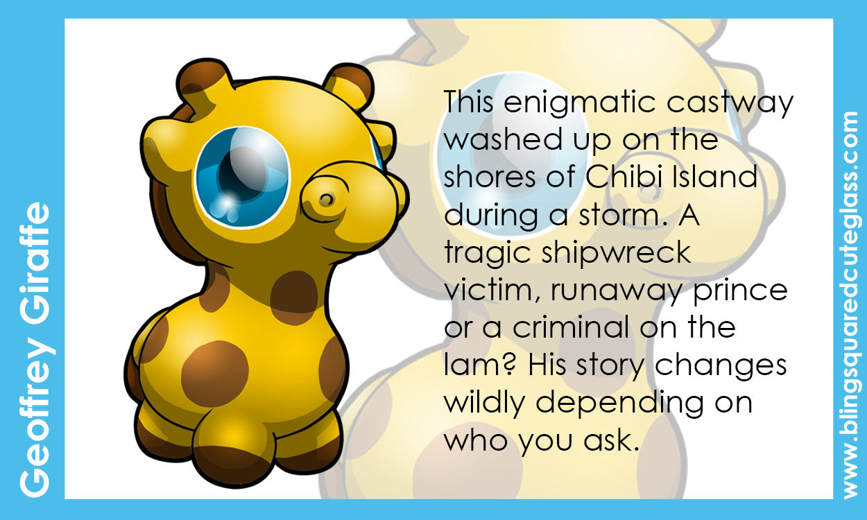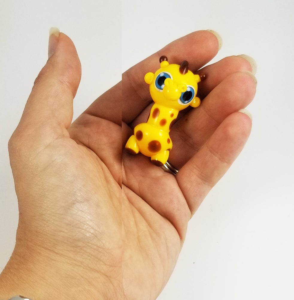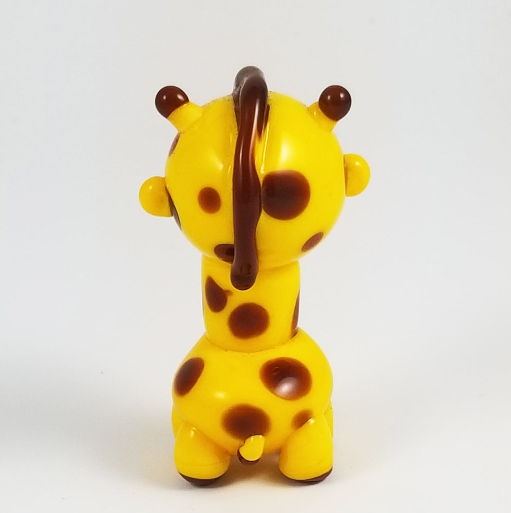 Geoffrey is sculpted with school bus yellow glass, featuring tiny ears, tail, legs, snout, nostril and ossicones (giraffe horns) details with medium brown mane, hooves, spots and ossicone and tail tips. With my signature blue eyes.