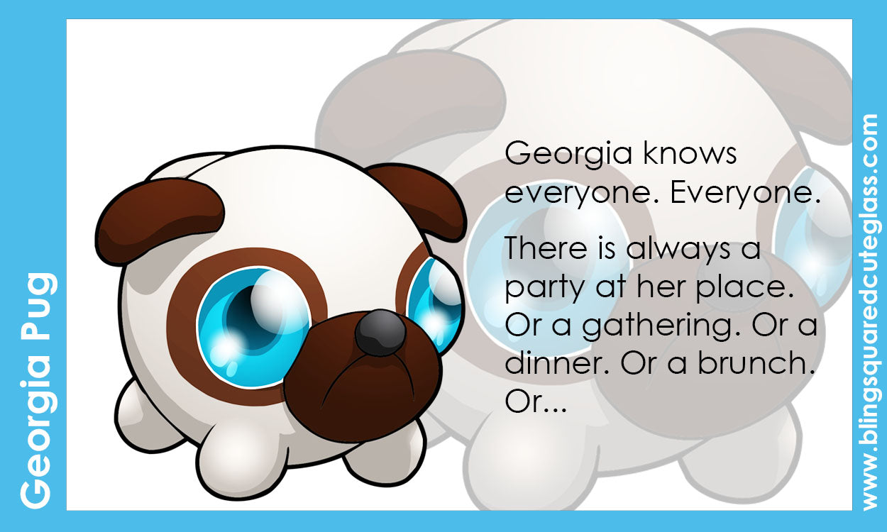 Georgia is sculpted in ivory glass with tiny feets and a cinnamon bun tail. Medium brown ear and squashed snout details (along with a tiny black nose). Featuring my signature blue eyes, bugged out in perfect Pug fashion.