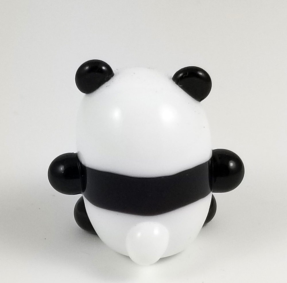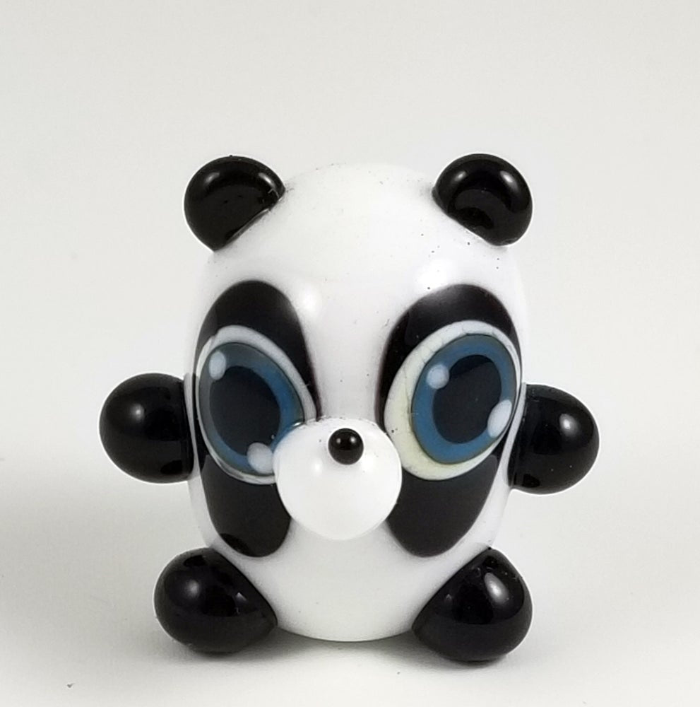 Johnny is sculpted in white with a little muzzle and tail. Black details include tiny ears, arms and feet and panda pattern striping on his back and face. With my signature blue eyes.