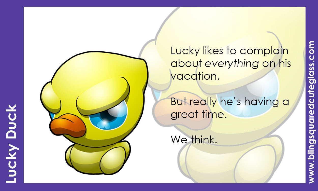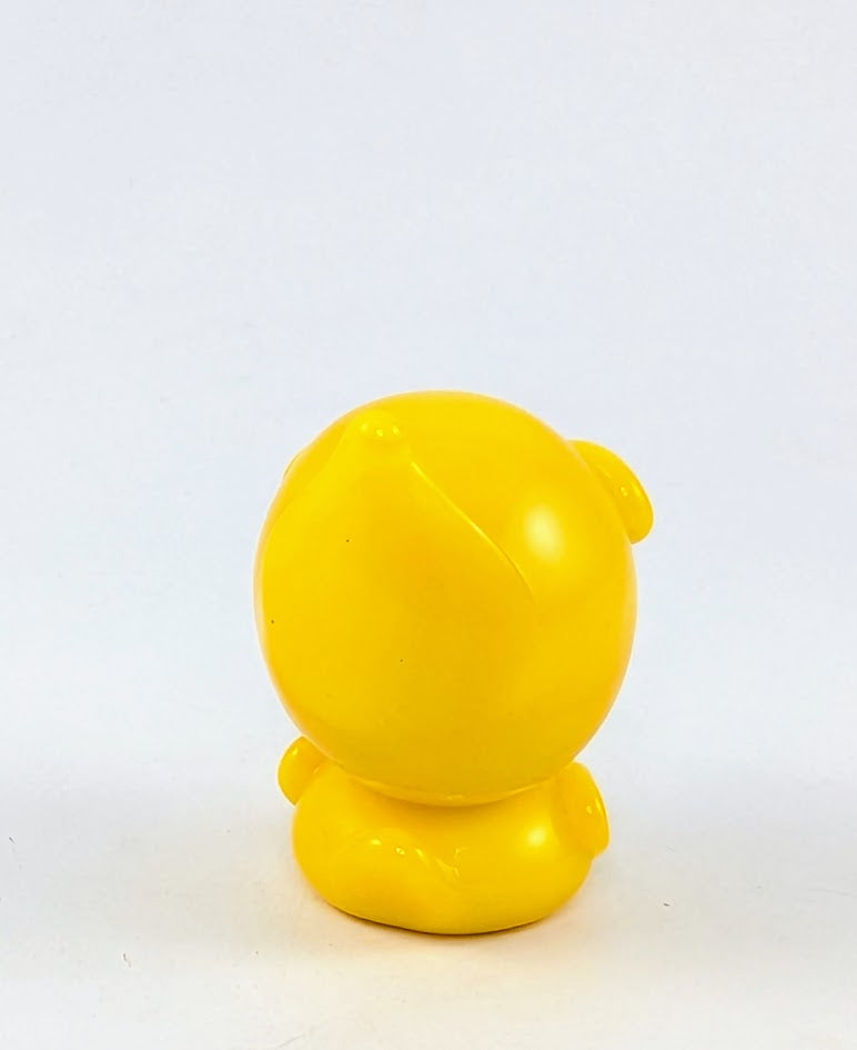 Sculpted in yellow glass, Lucky features a two part body style and transparent yellow wings and tail details. He has a bright orange bill and opaque yellow grumpy eyebrows. With our signature blue eyes.