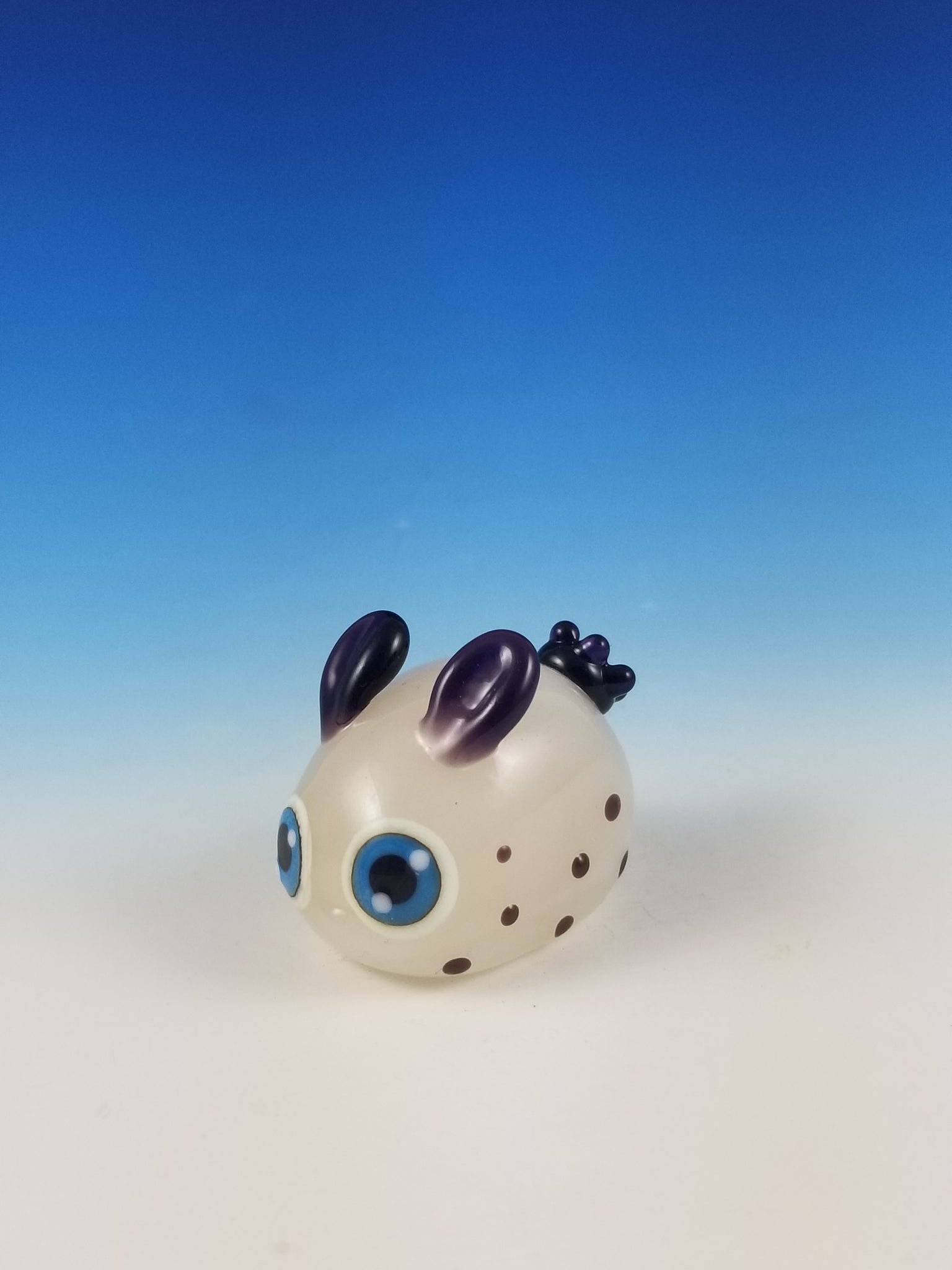 Sculpted in a semi transparent off white with tiny black spots and transparent purple fluffy tail and ears. With our signature blue eyes.