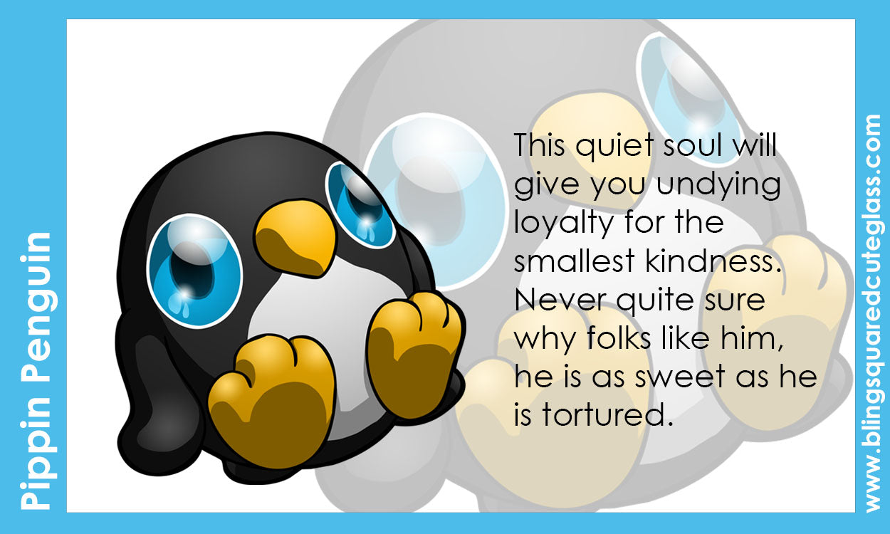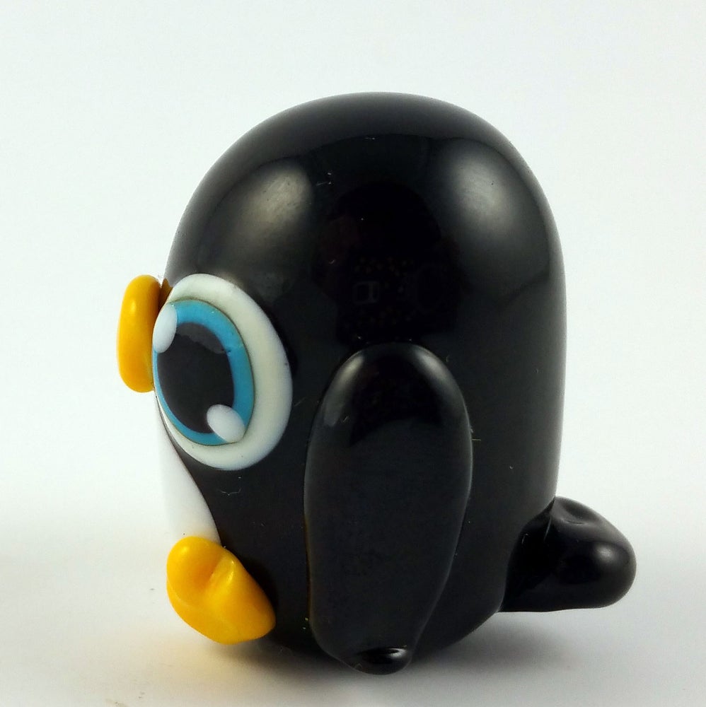 Pippin is sculpted in black glass with wing and tail details, a white tum and golden yellow flipper feet an beak. Finished with my signature blue eyes.