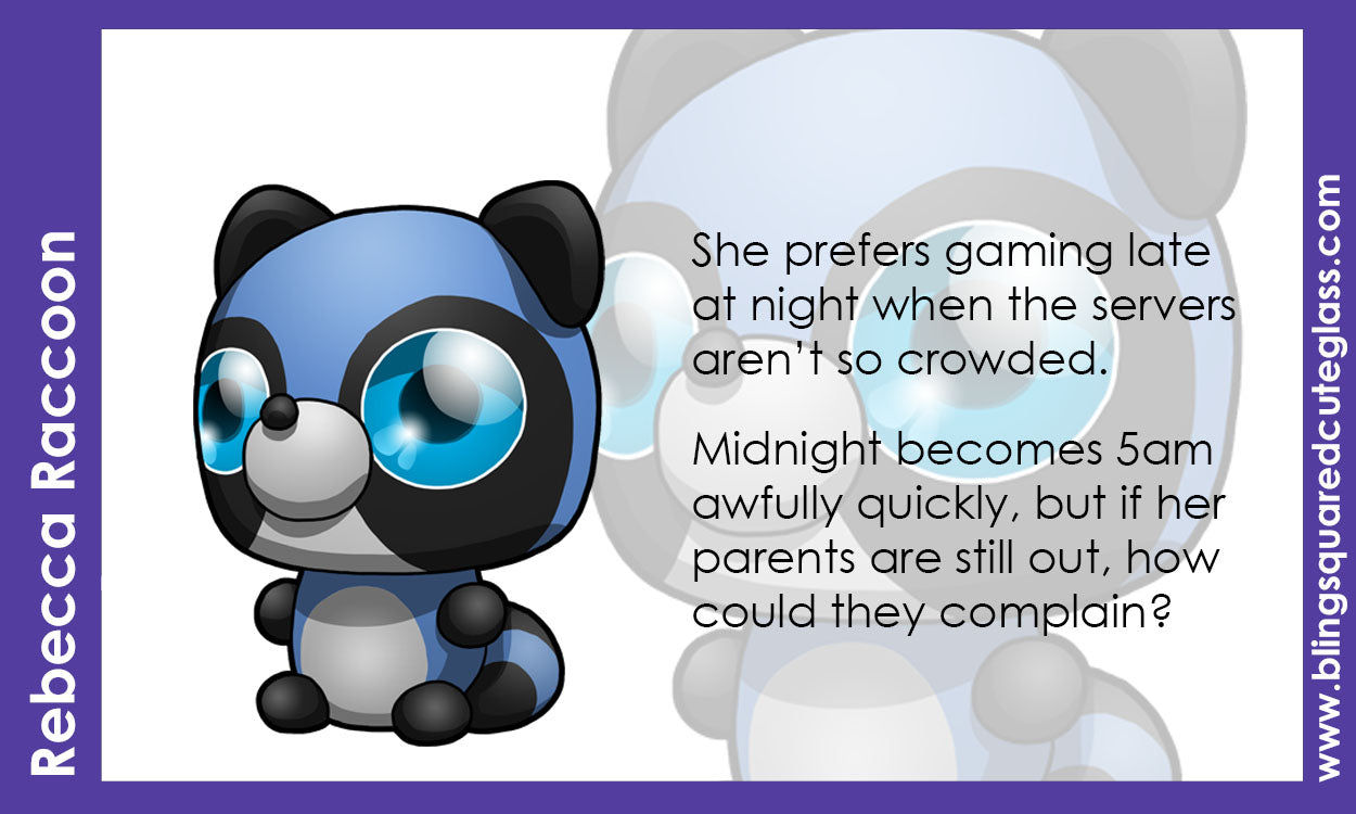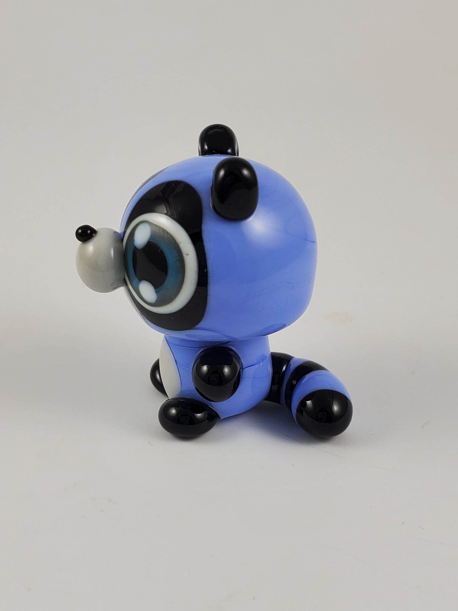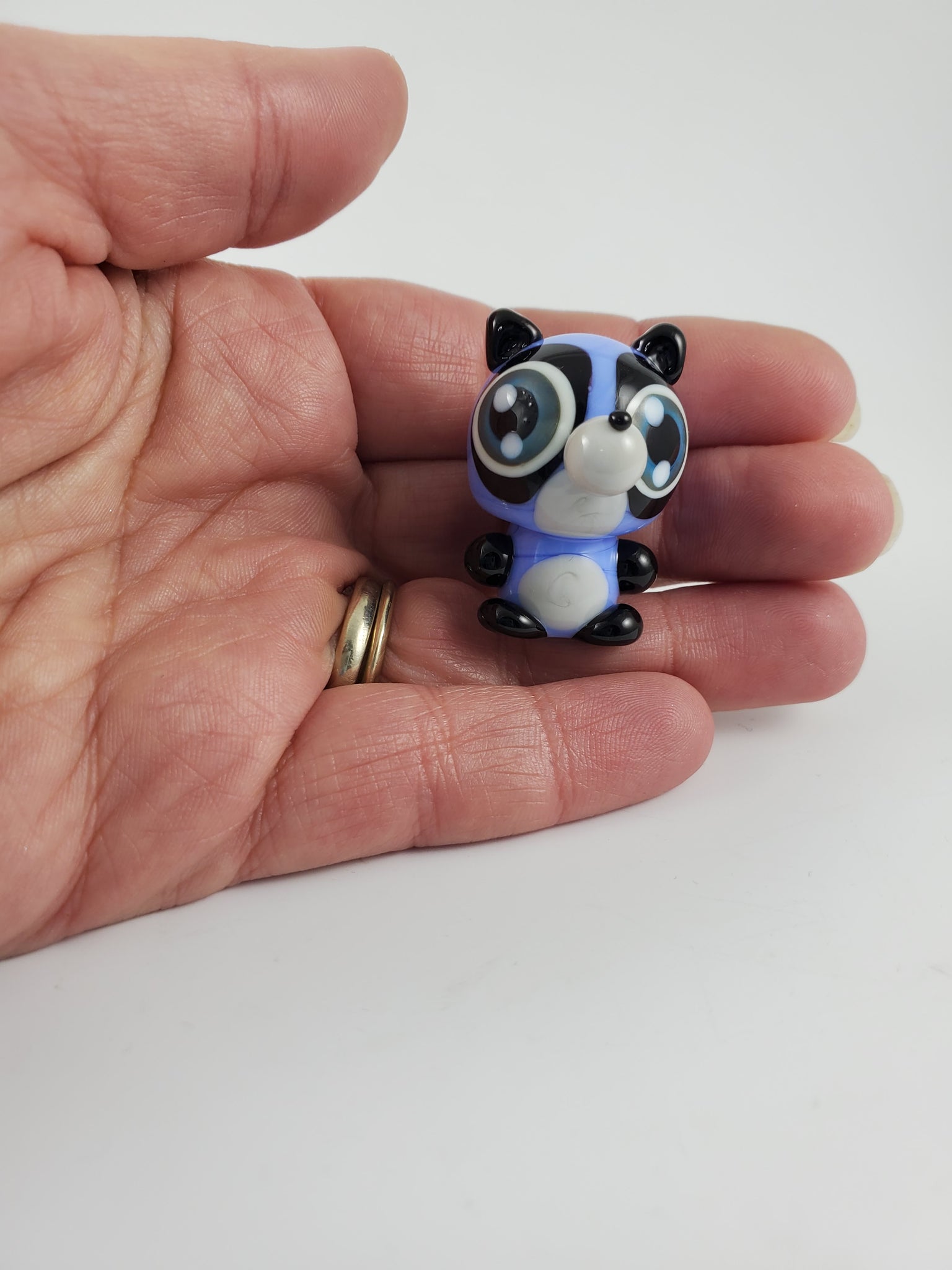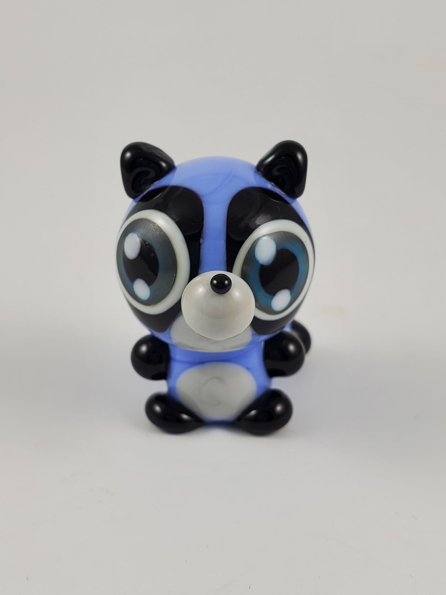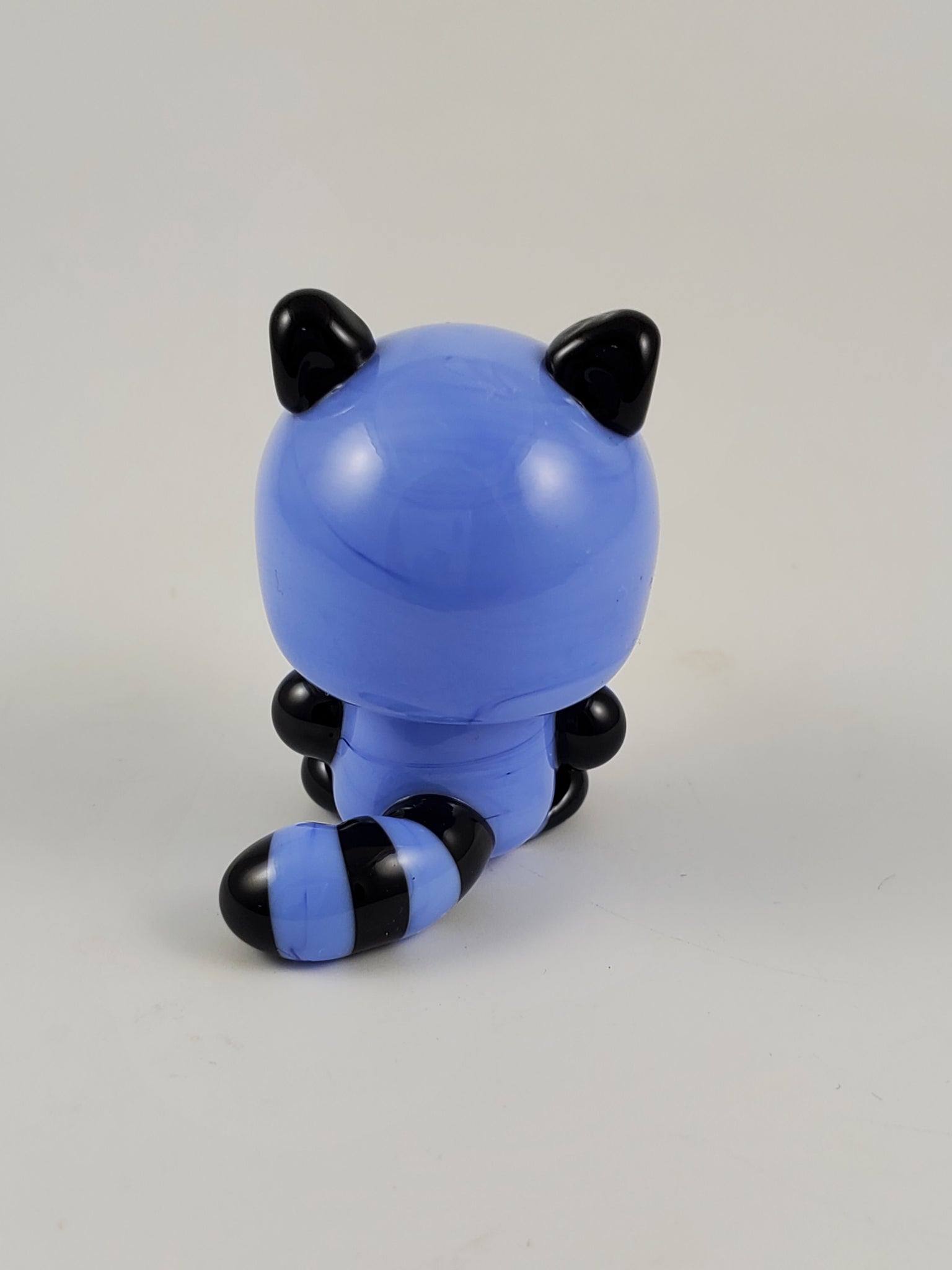 Rebecca is sculpted in periwinkle with a noggin and post body type and a unique flattened-chin head shape. Featuring black masking ears hands and feet and nose, palest grey tummy and snout and a fluffy periwinkle and black striped tail. Complete with my signature blue eyes.