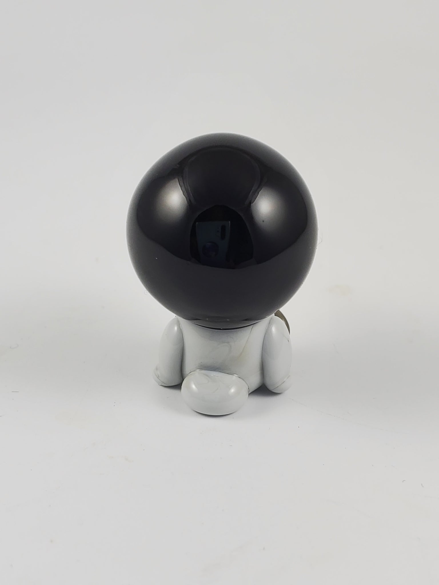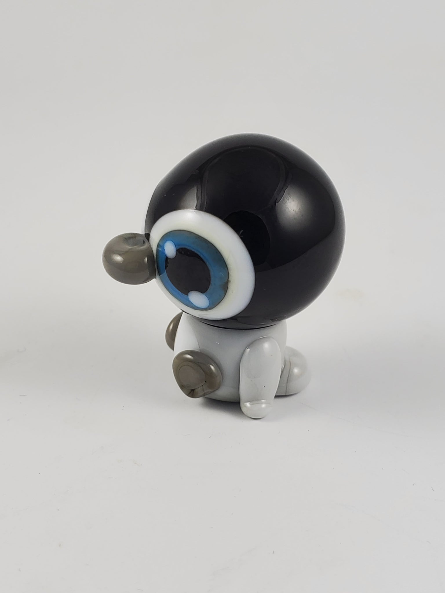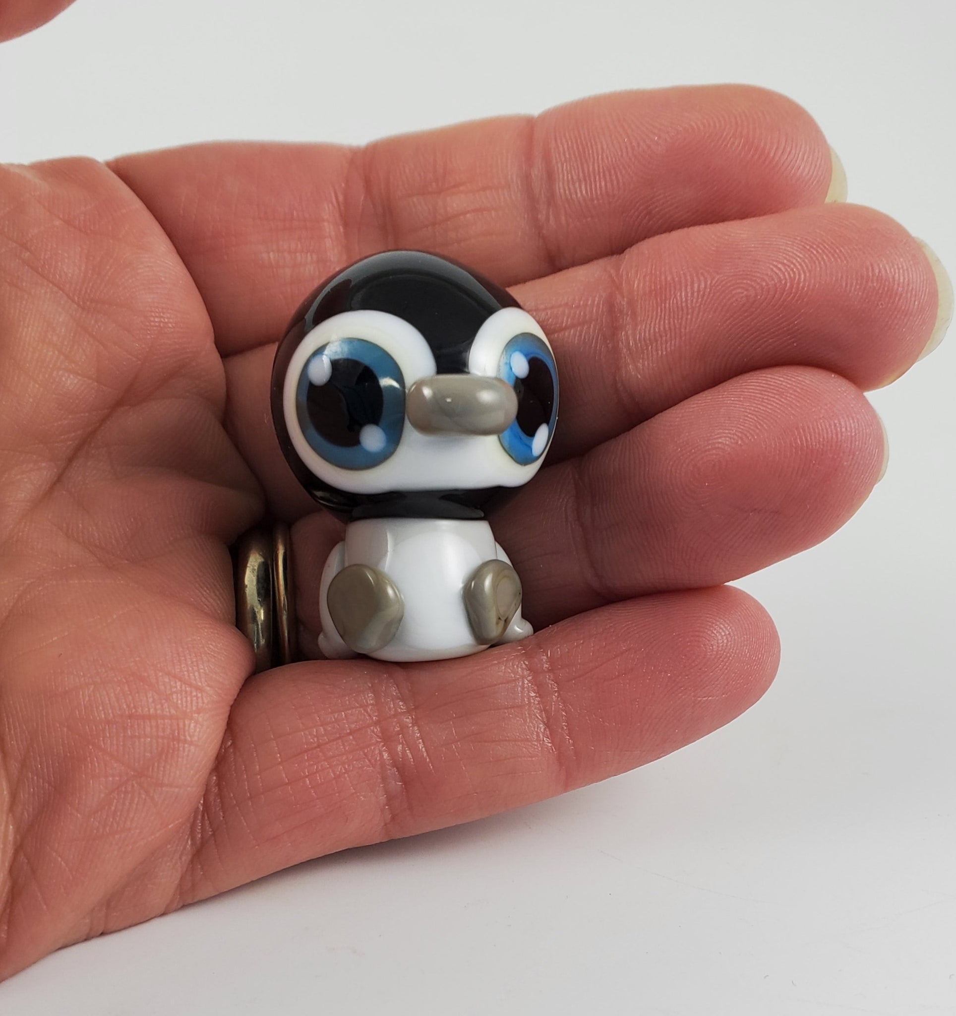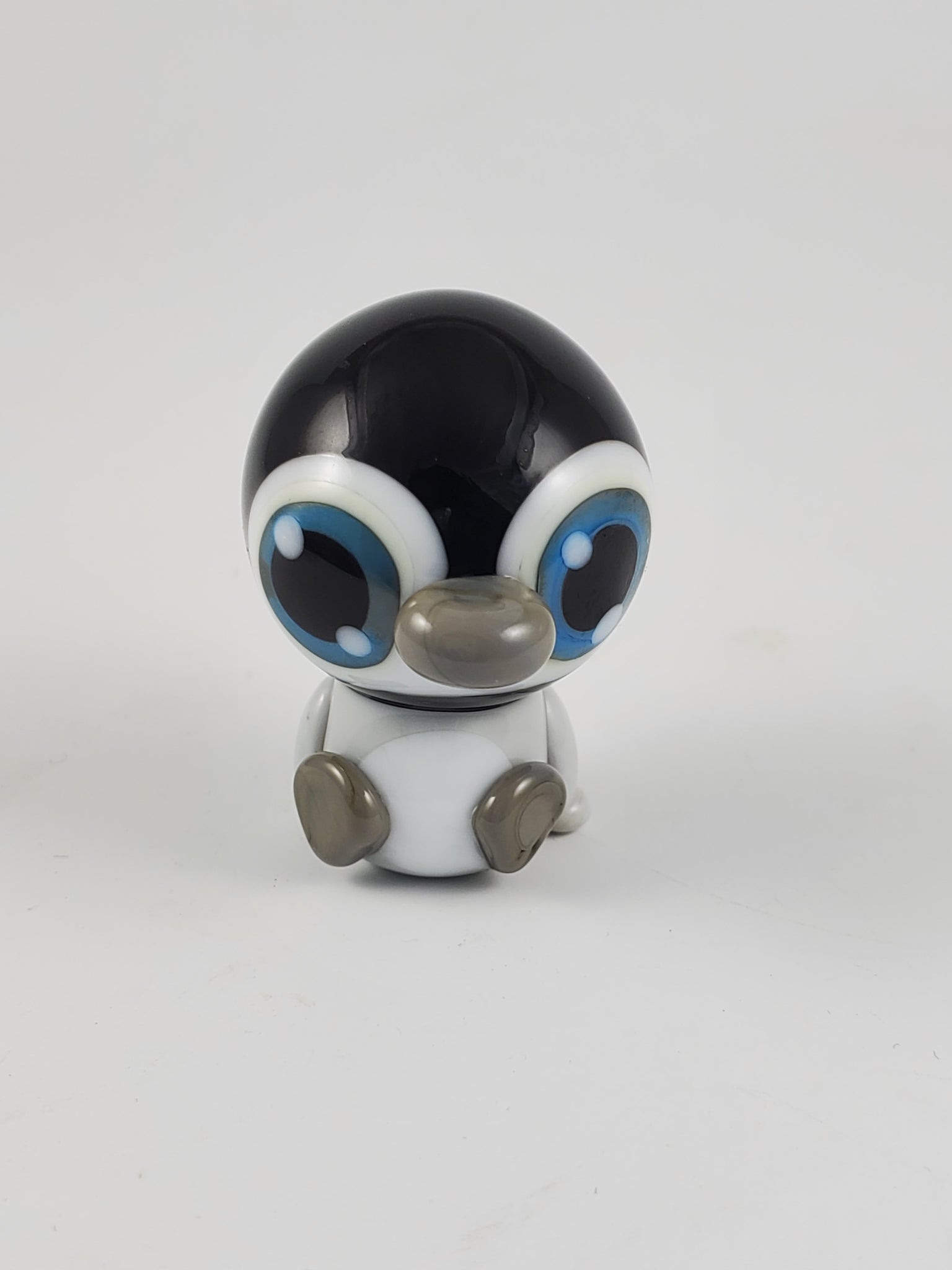 Sculpted in black and pale grey opaque glass, Smidgen features a two part body style and pale opaque grey wing and tail details. She has white masking and tum, and dark get little flipper feet and beak. With our signature blue eyes.