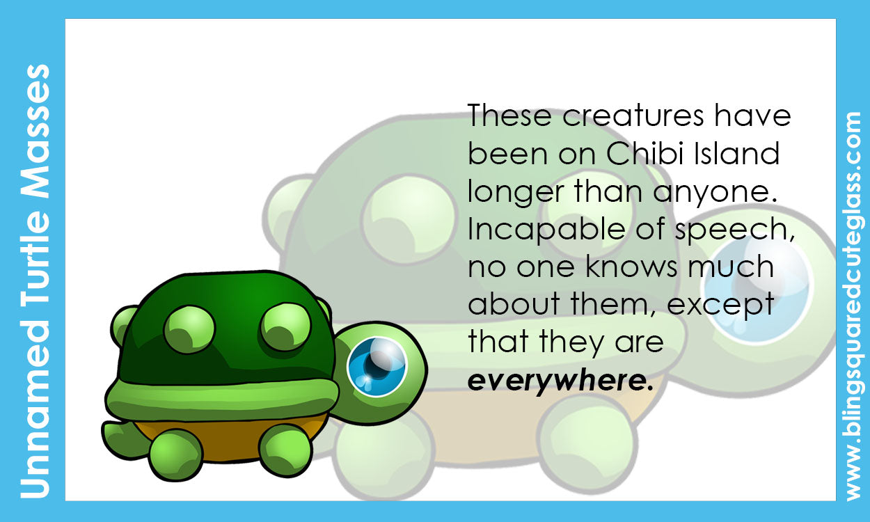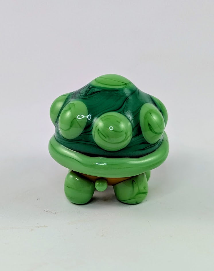 This little cutie is sculpted half in transparent yellow and half in grass green to give him a two-toned shell. Medium green shell rim and spot details finish out his little home, and we use medium green again to make his little noggin, feets and bitty tail. With our meticulously placed signature blue eyes.